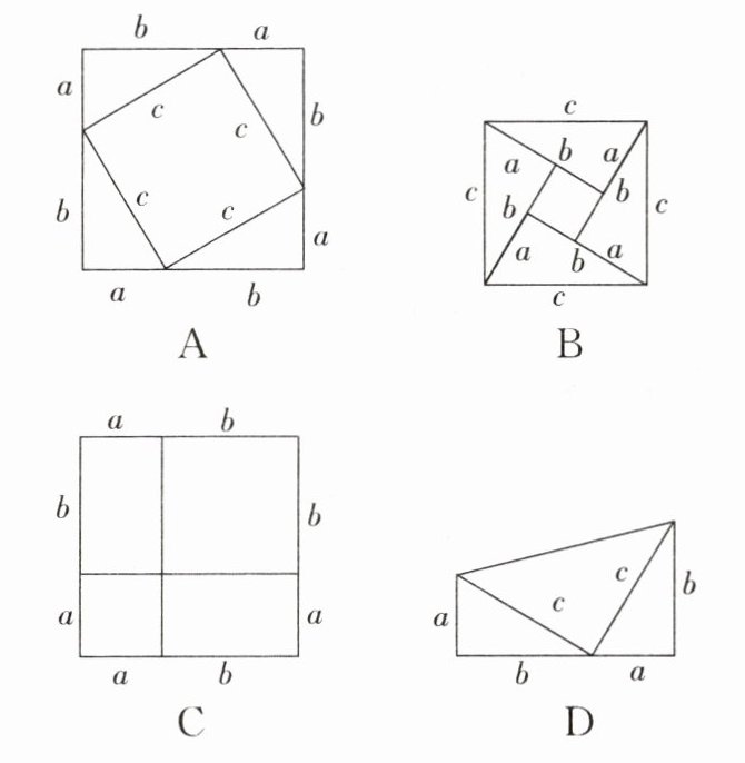 4. 在勾股定理的学习中,我们通过图形直观地验证了这一重要定理。这种借助几何图形来推导或验证数学规律和公式的方法称为“无字证明”,它体现了数形结合的思想。下列图形中,不能验证勾股定理的是(