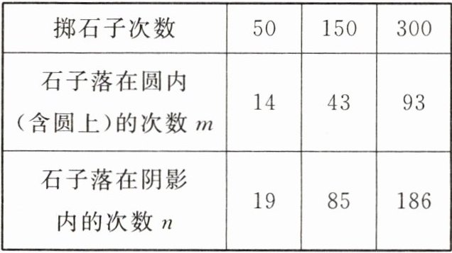 (2)随着试验次数的增多,石子落在圆内和阴影内的次数之比逐渐趋向于$1:2$,所以圆的面积约占封闭图形$ABC$面积的$\frac{1}{3}$.因为$S_{圆}=\pi\ \mathrm{m}^{2}$,所以封闭图形$ABC$的面积约为$3\pi\ \mathrm{m}^{2}$.