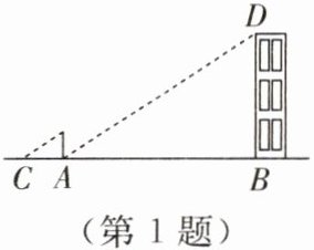 1. 如图所示,小明在测量楼高时,先测出楼房落在地面上的影长$BA$为$15\ m$,然后在$A$处竖立一根高$2\ m$的标杆,测得标杆的影长$AC$为$3\ m$,则楼高$BD$为