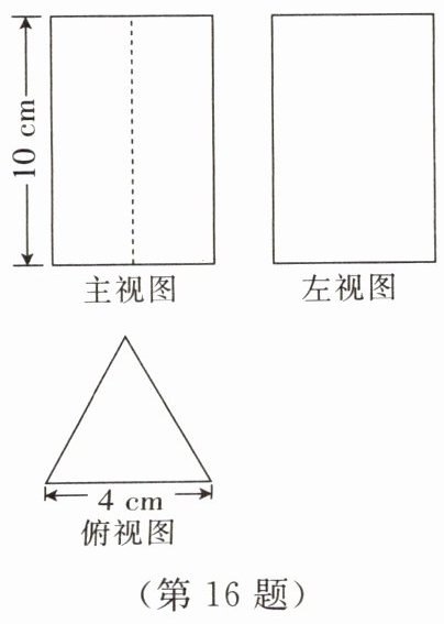 16. 一个几何体的三种视图如图所示, 它的主视图和左视图均为矩形,俯视图为等边三角形.