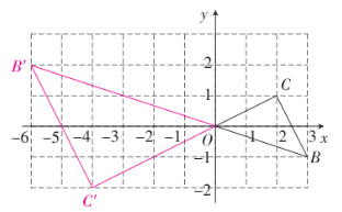 (1) 位似变换以原点为位似中心,相似比为$2$,在$y$轴左侧,所以$B(3,-1)$的对应点$B'$坐标为$(3×(-2),-1×(-2))=(-6,2)$,$C(2,1)$的对应点$C'$坐标为$(2×(-2),1×(-2))=(-4,-2)$,然后连接$O$、$B'$、$C'$得到$\triangle OB'C'$;