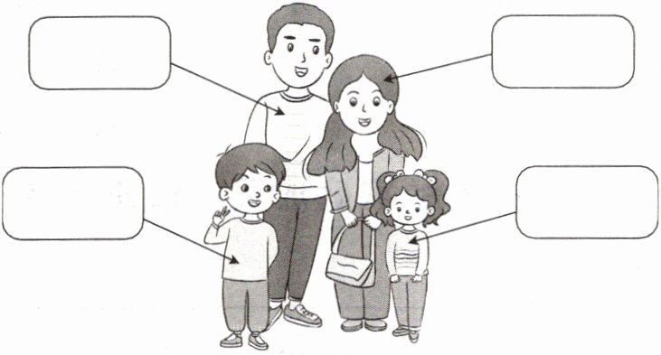 一、今天是校园亲子活动日。主持人请 Henry 上台介绍他的家庭成员。请听 Henry 的介绍,用数字 1—4 给图中的人物标序号。