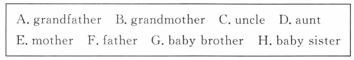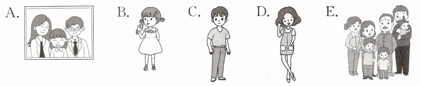 五、现在轮到明明上台介绍他的家庭成员。请听他的介绍,圈出他所提到的家庭成员。