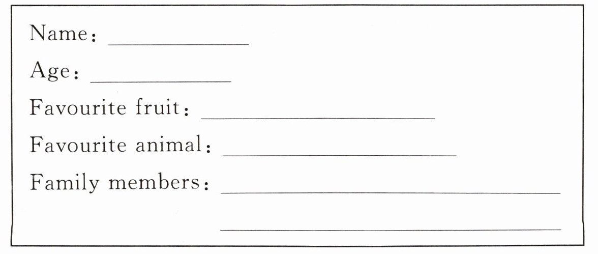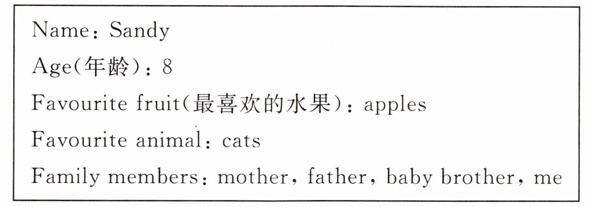 )5. I have a baby sister. 任务二:请仿照 Sandy 的信息卡,制作一个属于你自己的信息卡。
