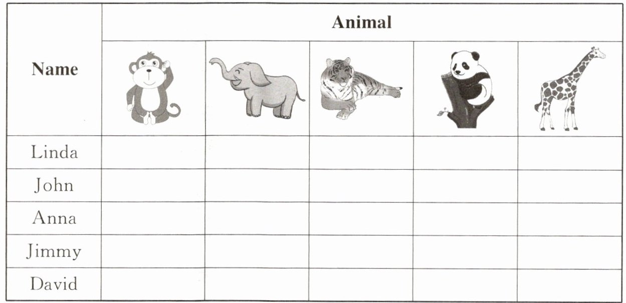 二、看完宣传片,导游让小朋友们自我介绍并说说自己喜欢什么动物。听句子,选出每个人喜欢的动物,画“√”。