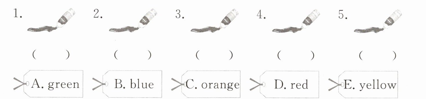 一、Sarah 和 Mike 一边看色彩翻翻书,一边认识颜色。听对话,将正确的颜色标签填在每管颜料下面的括号里。(填序号)