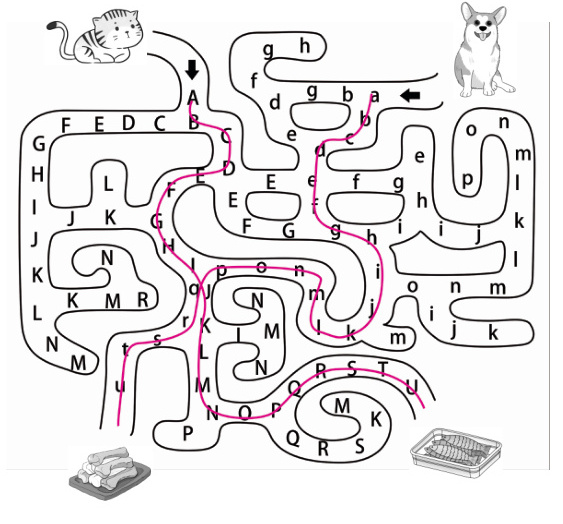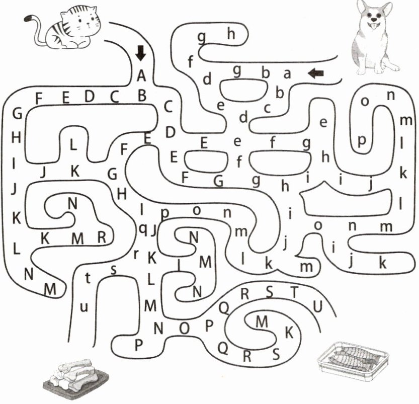 三、回家路上,Sarah 和 Mike 遇到了两只饥饿的小动物。请分别按照大小写字母在字母表中的顺序连线,帮助它们找到食物。