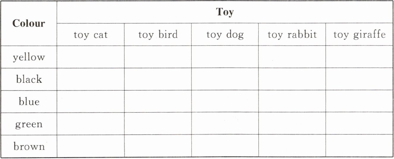 三、美术节有集章兑奖活动。听录音,找出下列玩具的颜色,在表格内相应的位置画“√”。