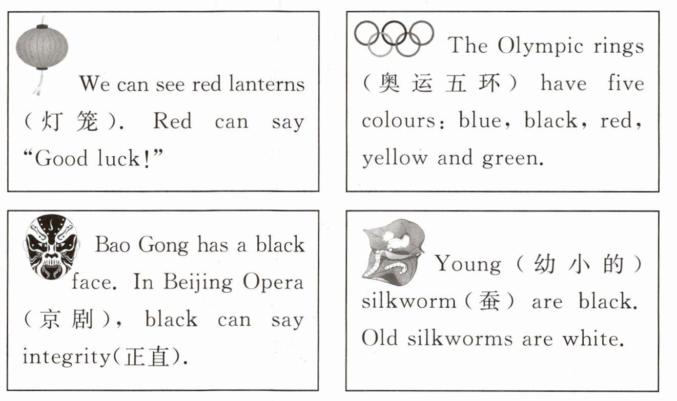 【解析】:本题主要考查对与颜色相关的科普知识的理解。第一题根据常识和卡片中“We can see red lanterns. Red can say ‘Good luck!’”可知红色代表好运,而不是“Go”(走);第二题根据卡片中“The Olympic rings have five colours: blue, black, red, yellow and green.”可知奥运五环有五种颜色;第三题根据卡片中“Bao Gong has a black face.”可知包公的脸是黑色的;第四题根据卡片中“Young silkworms are black. Old silkworms are white.”可知幼蚕是黑色的。