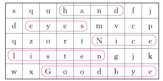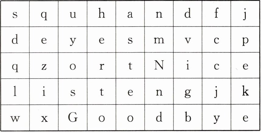 六、午休过后,大家聚在一起玩游戏。请根据句子提示,在字母框中圈出相应的单词。