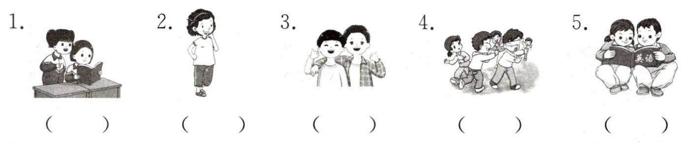 一、同学们因共同爱好或性格相合成为朋友。听对话,判断下列图片与你所听到的内容是否相符,相符的画“√”,不相符的画“×”。