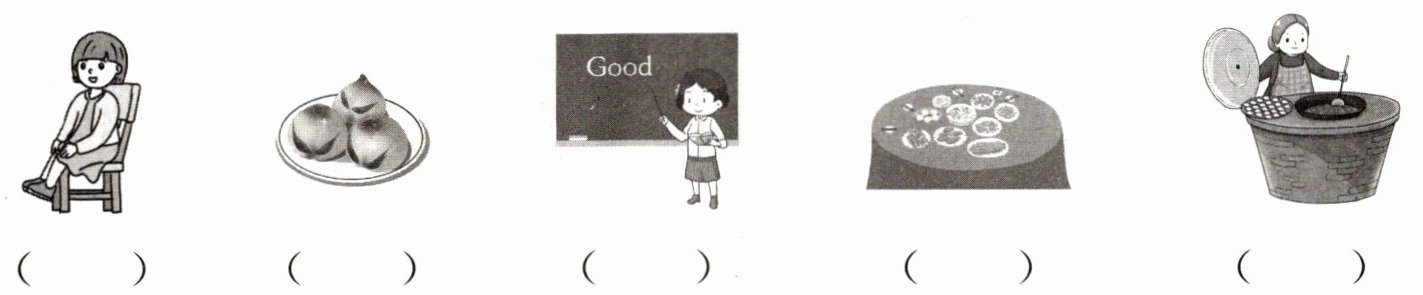 一、乐乐的妈妈过生日啦,亲友们都来为她庆祝。听句子,用数字1—5给下列图片排序。