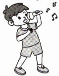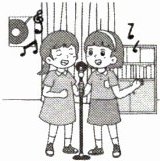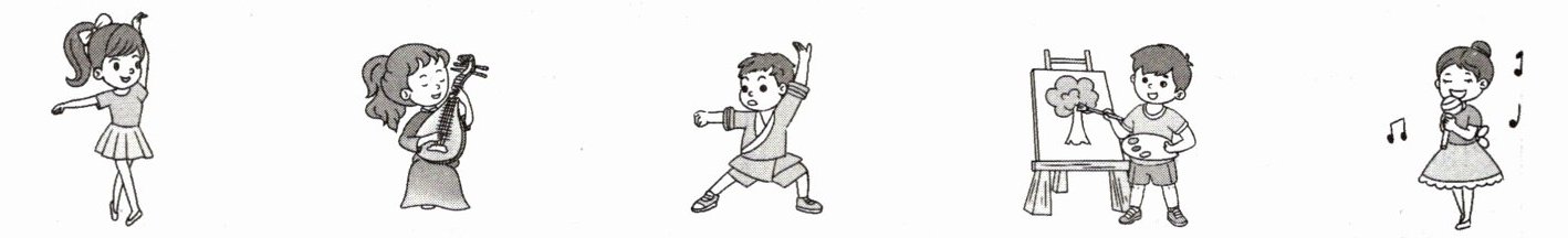 三、英语派对的现场热闹非凡,同学们都有哪些才艺呢?看图,写句子。