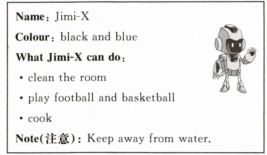 )2. What can Jimi-X do? ①cook ②drive a car ③play football ④clean the room ⑤tell stories ⑥play basketball ⑦do homework