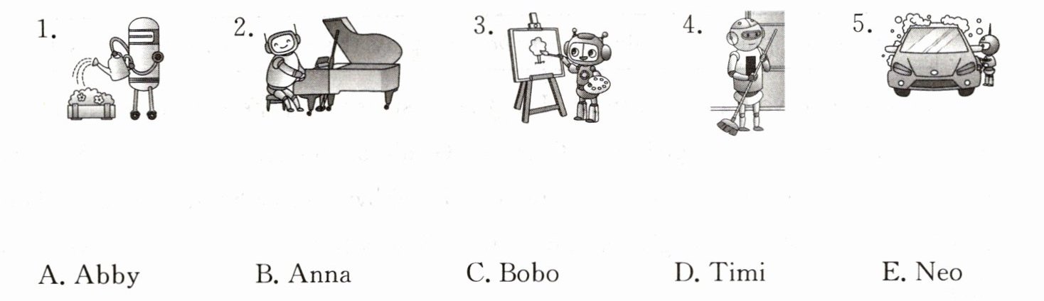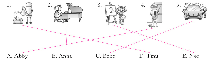 一、同学们走进了科技博物馆,参观了智能机器人科普展。听句子,将机器人图片与其对应的名字连线。