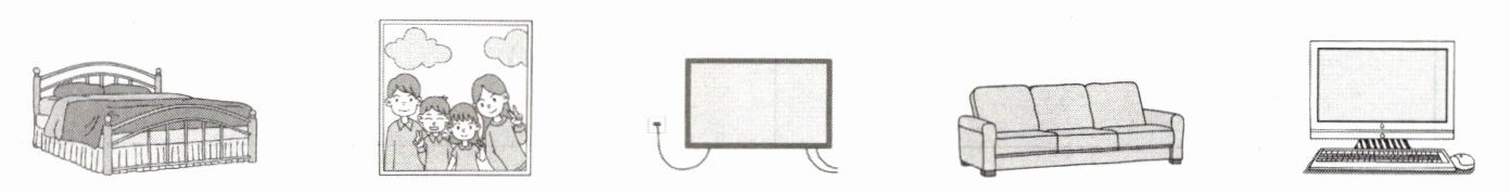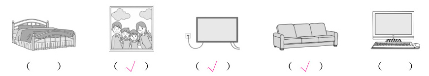 一、Alice乔迁新居,邀请了几个好朋友来家里做客。Alice正带着他们四处参观。请听Alice的介绍,选择她提到的物品,画“√”。