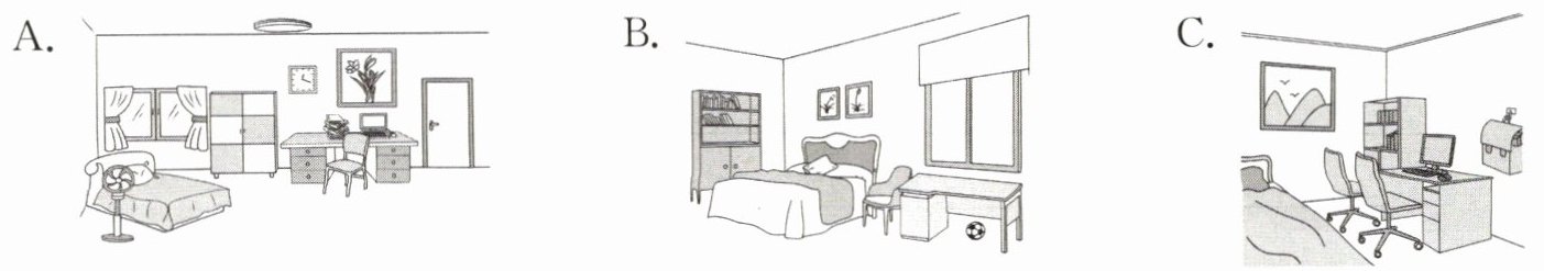 三、朋友们正在参观Alice的卧室。哪一间是她的卧室呢?请根据对话,圈出卧室图片的序号。