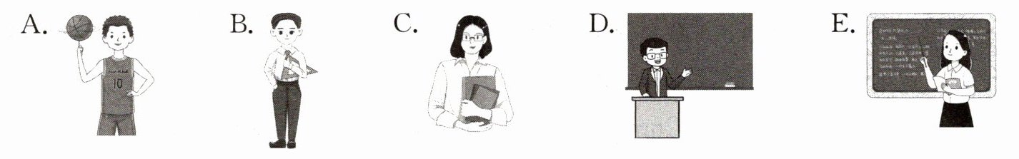 二、玲玲擅长画画,她给每位老师画了一幅肖像画当作教师节礼物。请根据她的描述,找到与描述相符的肖像画。