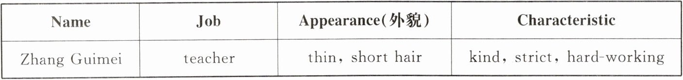 Zhang Guimei is a great teacher. She is thin. She has short hair. She is hard−working. Sometimes she is strict, but she is very kind. She helps many students. She is a great teacher