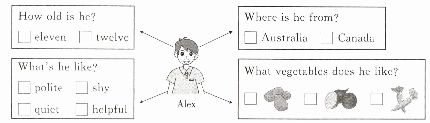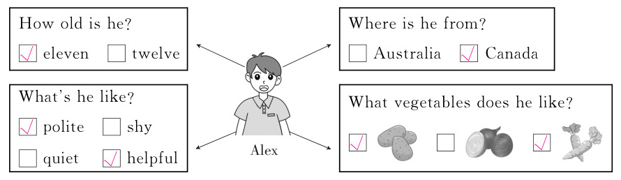 一、Mike 认识了一个新朋友。请听 Mike 介绍他的新朋友,在方框内勾选出与他介绍的内容相符的信息。