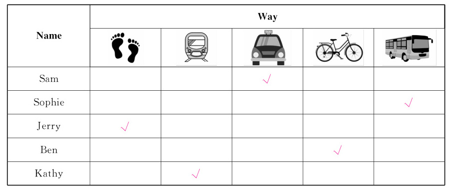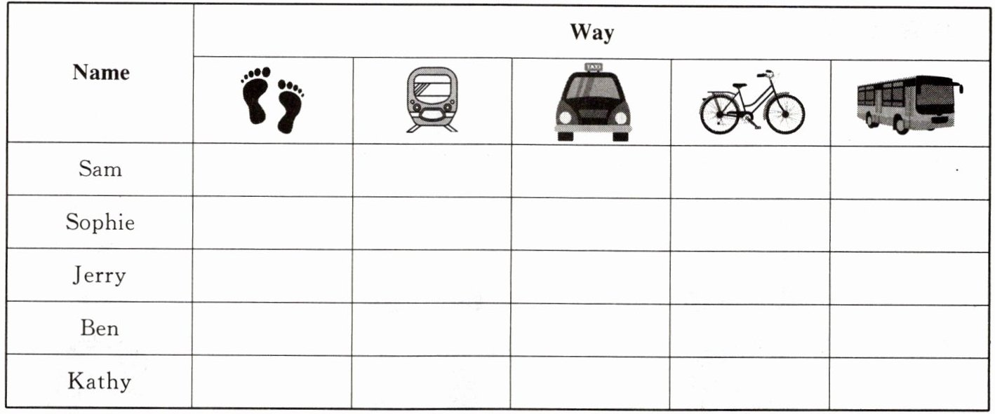 四、Sam 调查了几个好朋友上学的方式。听短文,在他们对应的出行方式下面画“√”。