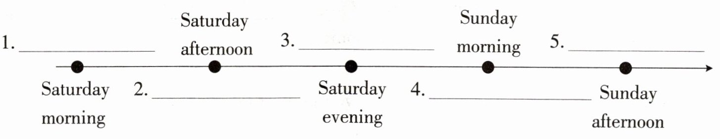 三、 Kate 向大明讲述了自己的周末计划。请根据 Kate 的描述,补全时间轴中的活动。