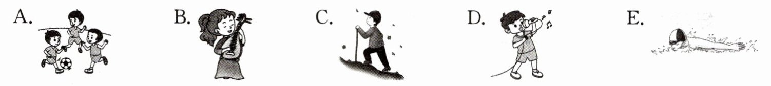 句子5“My father likes swimming very much.”表示“我的爸爸非常喜欢游泳”,图片E中一个人在游泳,所以5对应E。