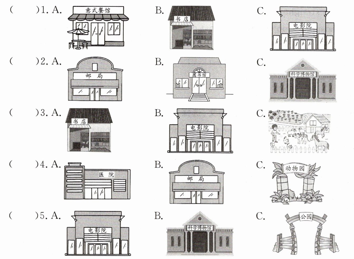 三、菲菲整理了她所在的社区不同场所的位置信息。听句子,选择正确的答语。