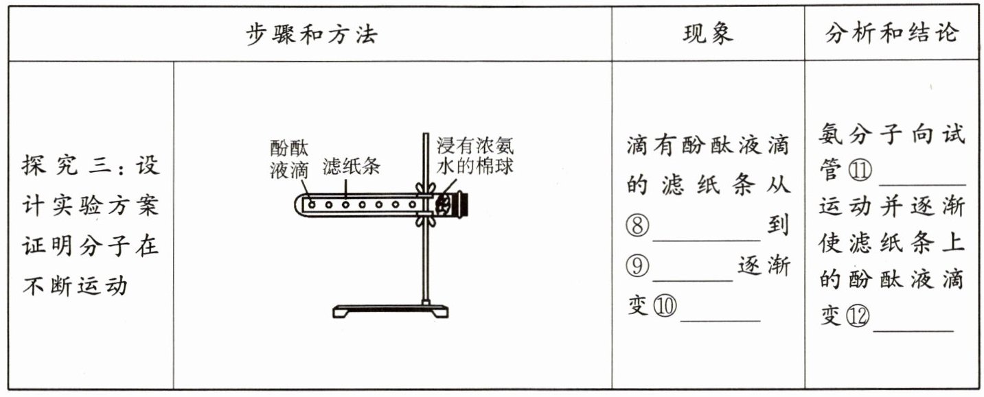 |探究三:设计实验方案证明分子在不断运动||滴有酚酞液滴的滤纸条从⑧______到⑨______逐渐变⑩______|氨分子向试管⑪______运动并逐渐使滤纸条上的酚酞液滴变⑫______|