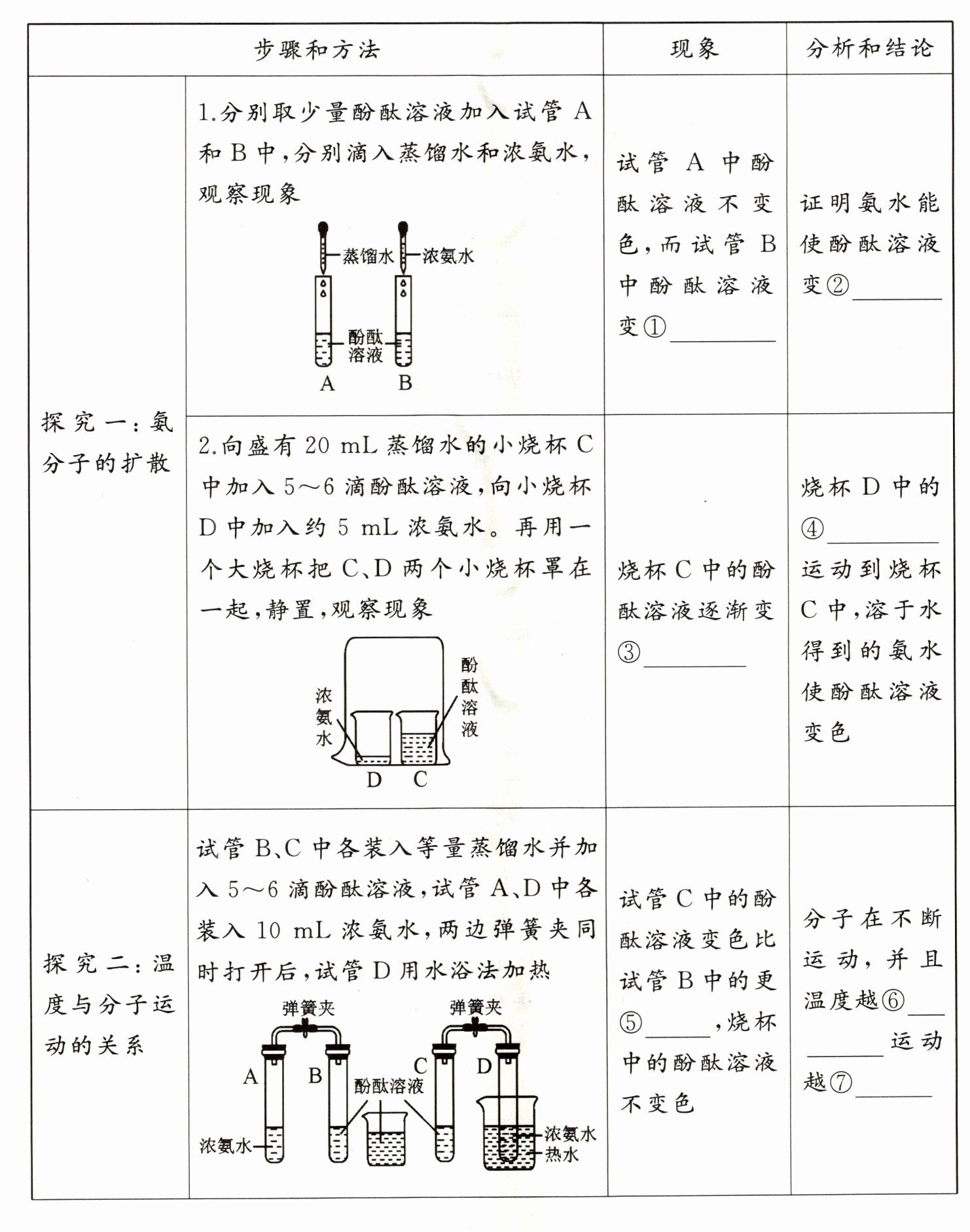 |试管C中的酚酞溶液变色比试管B中的更⑤______,烧杯中的酚酞溶液不变色|分子在不断运动,并且温度越⑥______运动越⑦______|