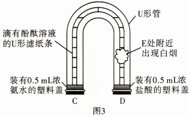 (3) 实验三:如图3所示,实验时将滴有酚酞溶液的滤纸条置于U形管中,分别快速向C和D处的塑料盖中滴入0.5mL浓氨水和浓盐酸,一会儿后发现酚酞溶液自C处向E处逐渐变红,但颜色逐渐变浅,且在E处附近出现“白烟”。