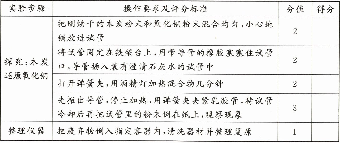 | 探究:木炭还原氧化铜 | 把刚烘干的木炭粉末和氧化铜粉末混合均匀,小心地铺放进试管 | 2 | |