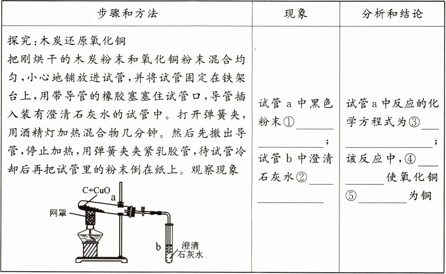 把刚烘干的木炭粉末和氧化铜粉末混合均匀,小心地铺放进试管,并将试管固定在铁架台上,用带导管的橡胶塞塞住试管口,导管插入装有澄清石灰水的试管中。打开弹簧夹,用酒精灯加热混合物几分钟。然后先撤出导管,停止加热,用弹簧夹夹紧乳胶管,待试管冷却后再把试管里的粉末倒在纸上。观察现象 | 试管a中黑色粉末①______;试管b中澄清石灰水②______ | 试管a中反应的化学方程式为③______;该反应中,④______使氧化铜⑤______为铜 |