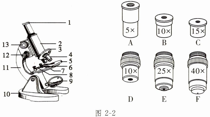 7. 单目显微镜的结构如图2-2所示,这台显微镜备有三种目镜和三种物镜。请根据图示,结合有关操作技能,完成下列习题。