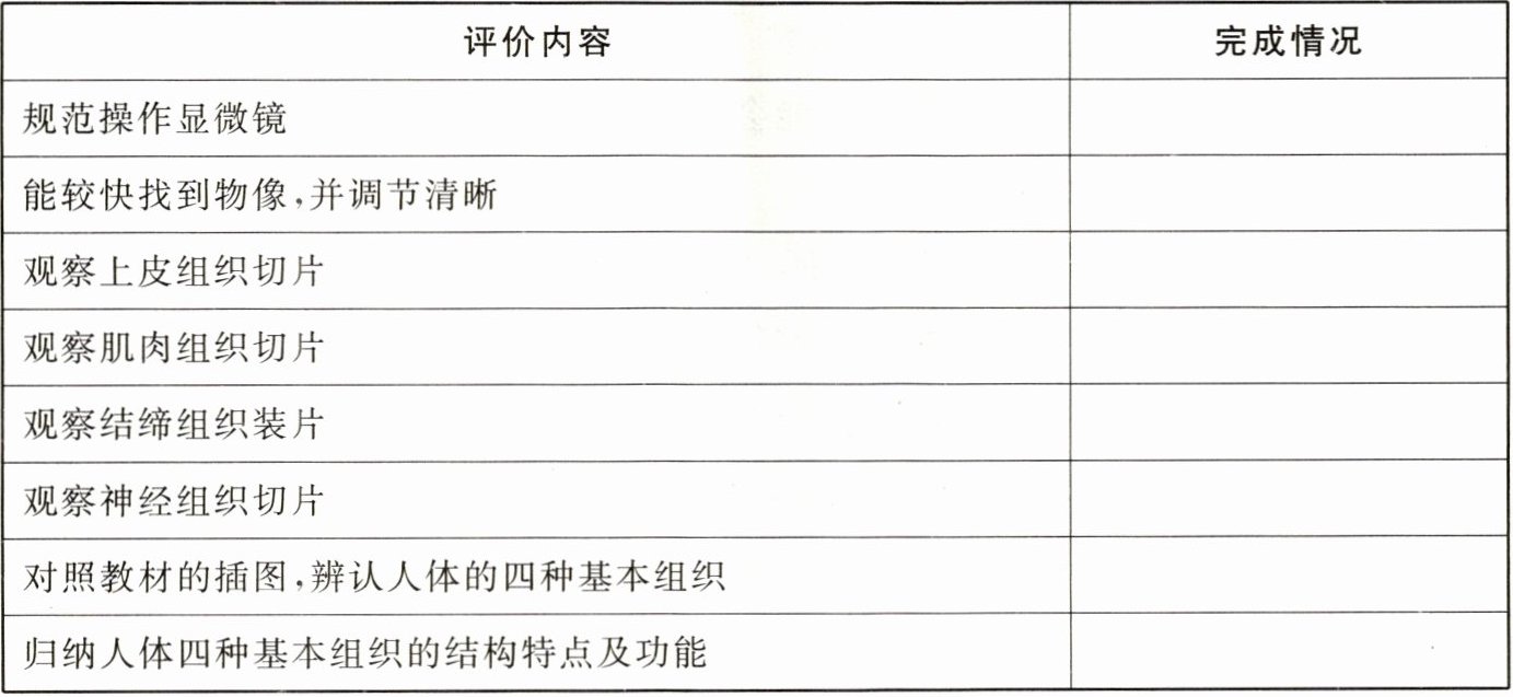 | 对照教材的插图,辨认人体的四种基本组织 | 能准确辨认 |