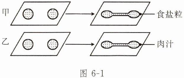 取两片载玻片,编号为甲、乙。从草履虫培养液的表层吸取培养液,在甲、乙载玻片的两端各滴一滴草履虫培养液,用牙签分别在载玻片的两个液滴之间轻划一下,使两滴培养液连通。如图 6 - 1 所示,在甲、乙载玻片的右侧培养液的边缘分别放食盐粒和肉汁后,用放大镜观察培养液中的草履虫的运动。一段时间后,甲、乙载玻片上的草履虫会分别。