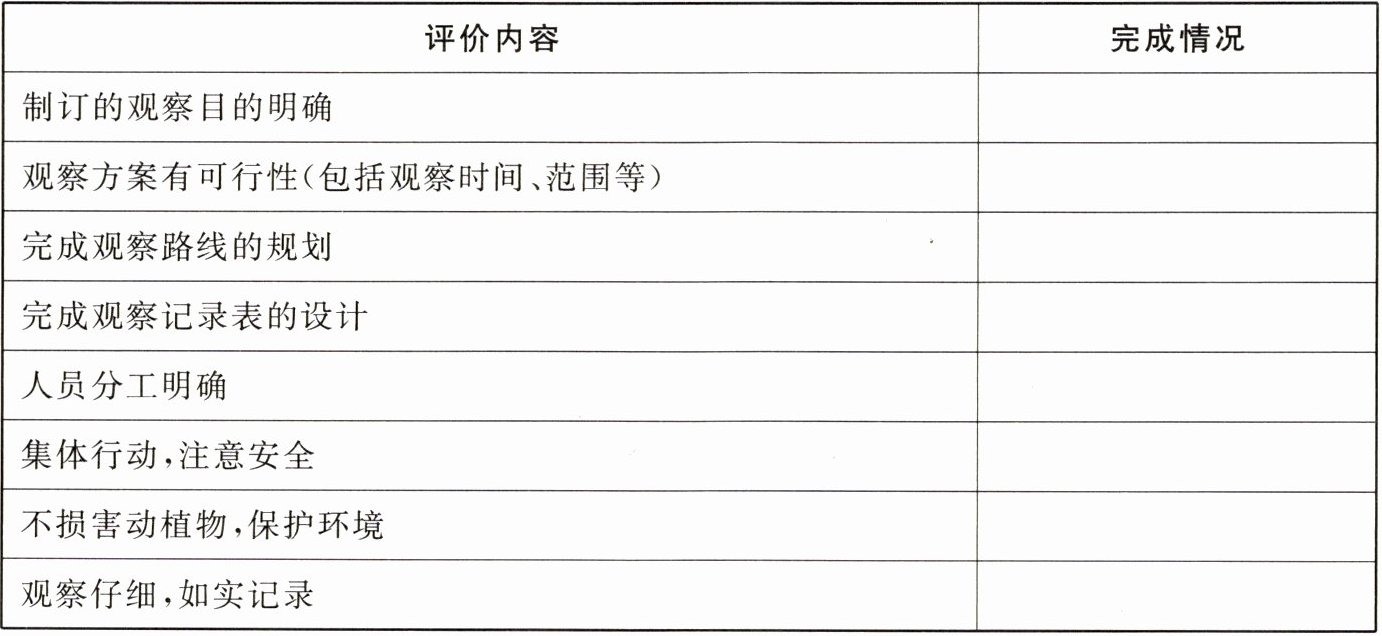 1. 示例:向日葵(提供食物、观赏);蚂蚁(分解有机物、维持生态平衡)。2. 示例:向日葵和蒲公英(共同点:有根、茎、叶、花、果实、种子,能光合作用;不同点:向日葵植株高大、花大、种子大;蒲公英植株矮小、种子有冠毛)。3. 观察角度、工具、时间、注意力、记录准确性。4. 观察对象:蚂蚁;目的:观察觅食行为和通讯;时间:周末上午;地点:校园花坛;工具:放大镜、面包屑;步骤:放诱饵→观察行为→记录交流方式;注意:不干扰,安全。5. 均合格。