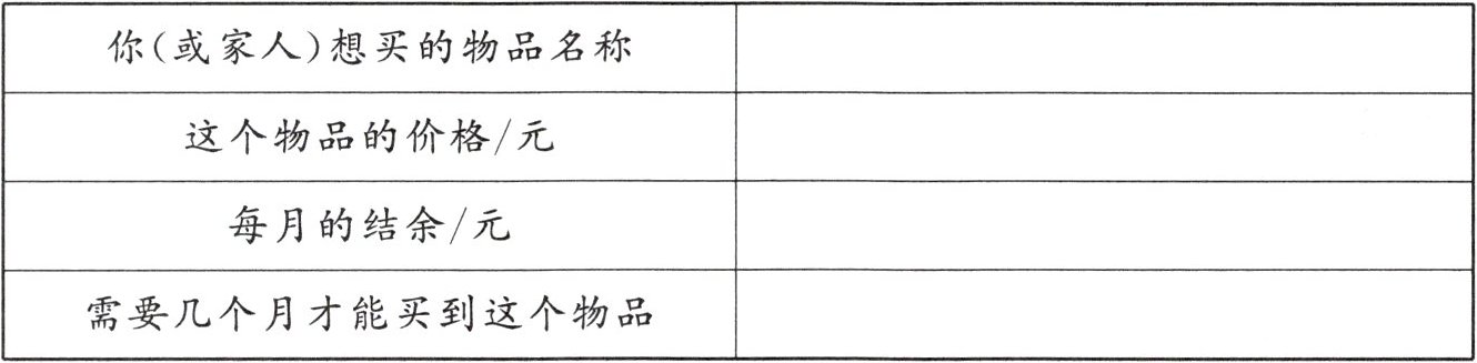 5. 生活中,你(或家人)也一定遇到过节余问题,请你利用下面的表格记录一下。