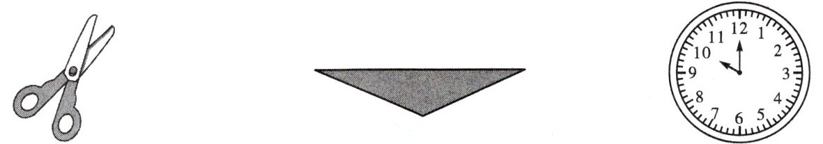 剪刀刀刃形成的角、红领巾的三个角、钟面上时针与分针形成的角。(部分答案不唯一,图略)