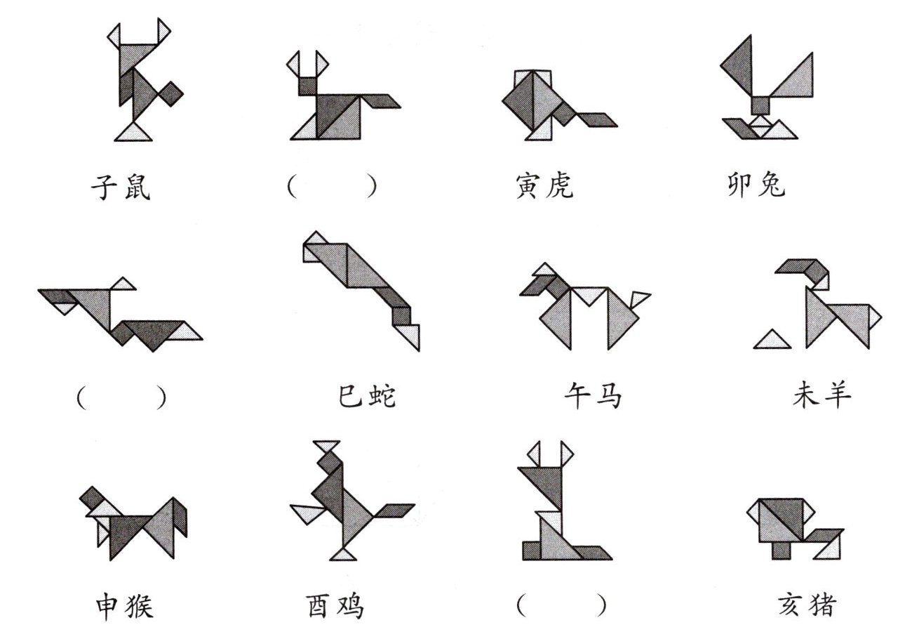 1. (1)根据七巧板拼成的形状特征,结合十二生肖的形态: