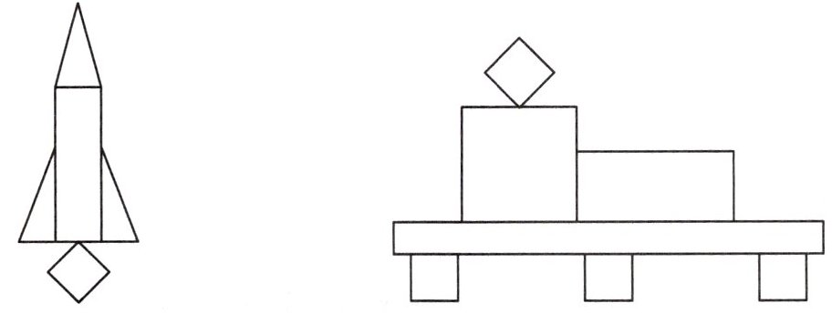 左图:给火箭中部呈长边的四边形(长方形机身)涂上黄色,给底部掉落的小四边形(正方形)涂上红色。
