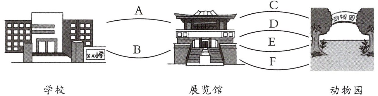 2. 从学校经过展览馆到动物园,一共有多少种不同的路线?(用你喜欢的方式表示所有的路线)