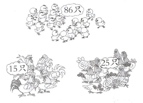 左图:求小鸡和两群鸡的总数,先算25只和15只鸡的总数,再加86只小鸡,与先算86只小鸡加25只鸡,再加15只鸡,结果相同。