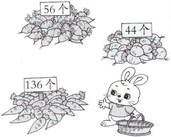 右图:求三种蔬菜的总数,先算56个和44个蔬菜的总数,再加136个蔬菜,与先算136个蔬菜加56个蔬菜,再加44个蔬菜,结果相同。