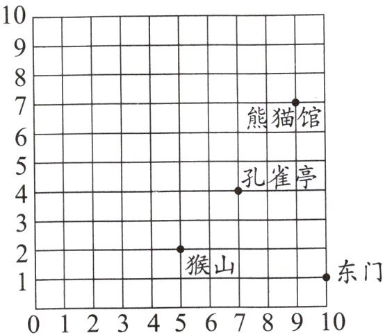已知孔雀亭$(7,4)$,猴山$(5,2)$,熊猫馆$(9,7)$,东门$(10,1)$,再根据数对与地点的对应关系:
