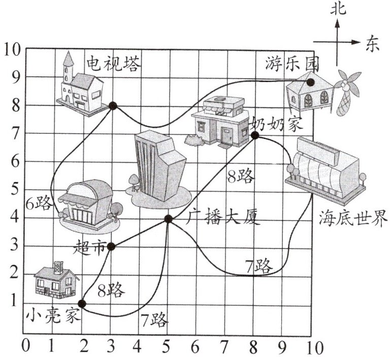 (1)小亮和妈妈乘坐$8$路公交车去奶奶家,沿途有哪些建筑物?分别在什么位置?请用数对表示出来。