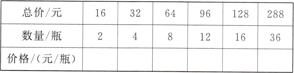 $8$,$8$,$8$,$8$,$8$,$8$;发现总价与数量成正比例关系(因为$\frac{总价}{数量}=单价$(一定))。