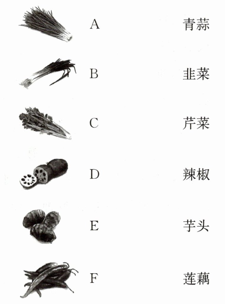 A-青蒜,B-韭菜,C-芹菜,D-莲藕,E-芋头,F-辣椒