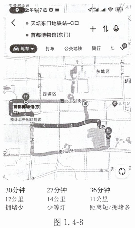 12. 假期里,小华准备和父母一起去首都博物馆参观。小华爸爸驾车从天坛东门附近出发,出发前他用导航软件查询出行路线,导航软件提供的三条路线如图1.4-8所示(1公里= 1km)。请你根据图上的信息及所学知识分析下列问题: