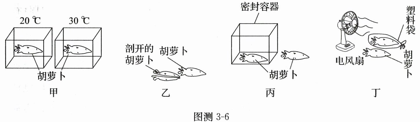 17. 保留水分是蔬菜和水果保鲜的一个方面,为了探究影响蔬菜和水果水分散失快慢的因素,小军同学进行了猜想并设计了实验方案,如图测3-6所示。